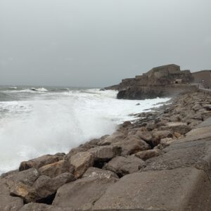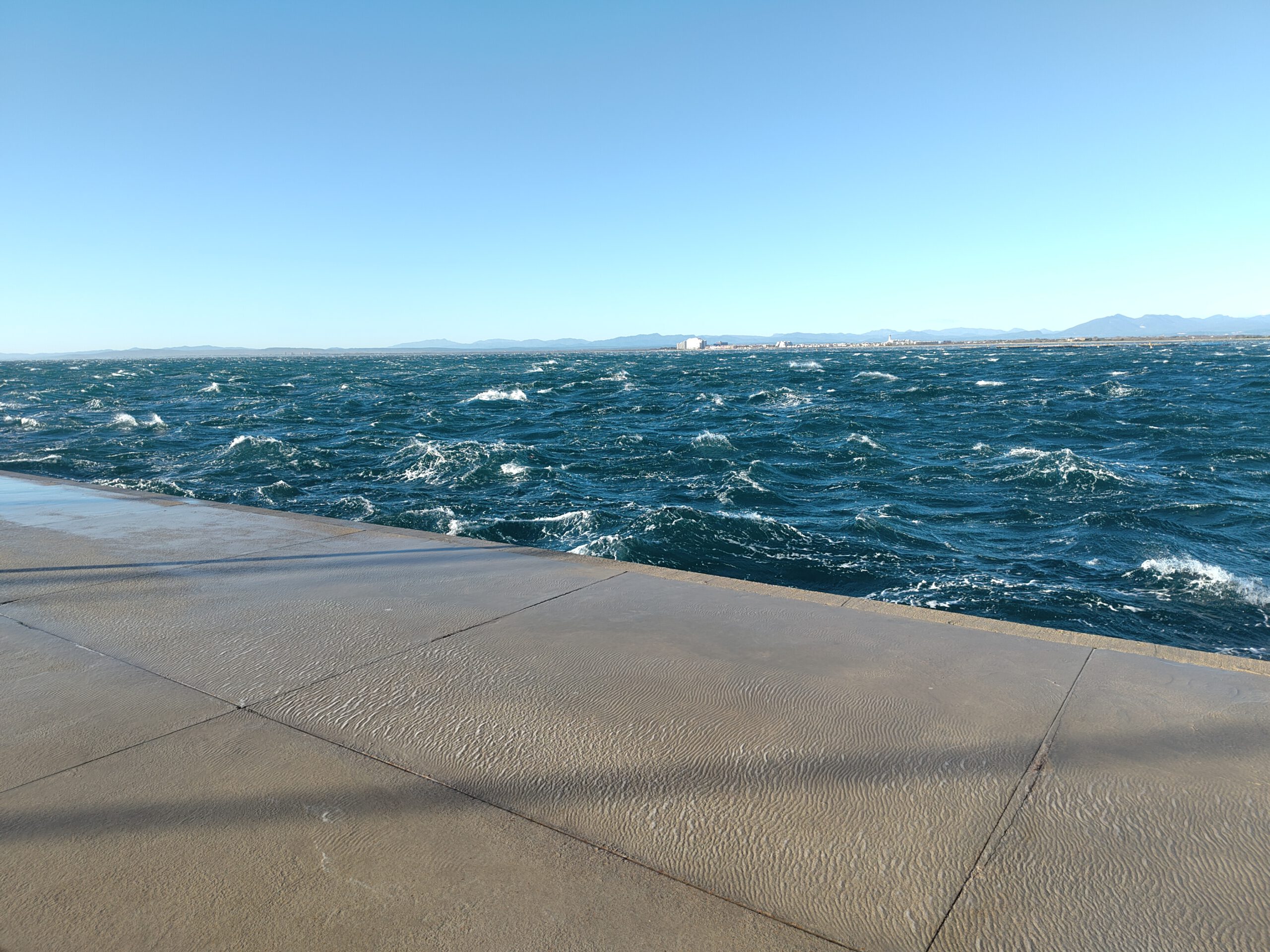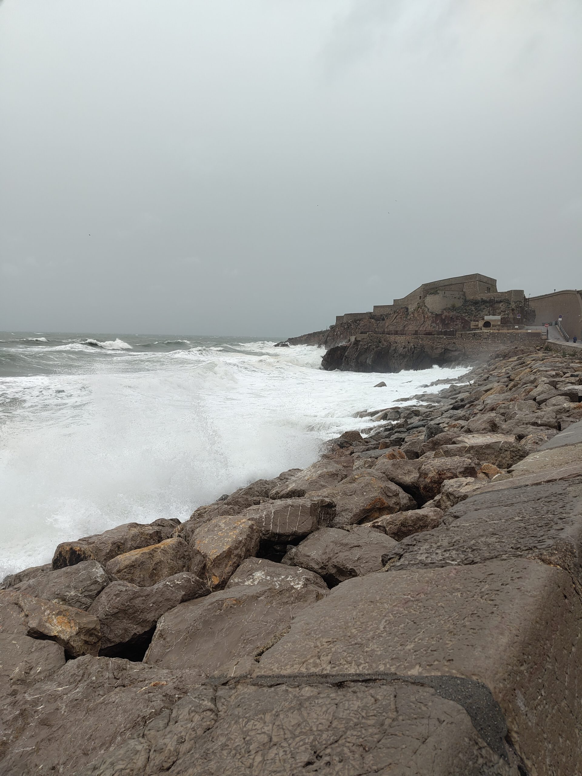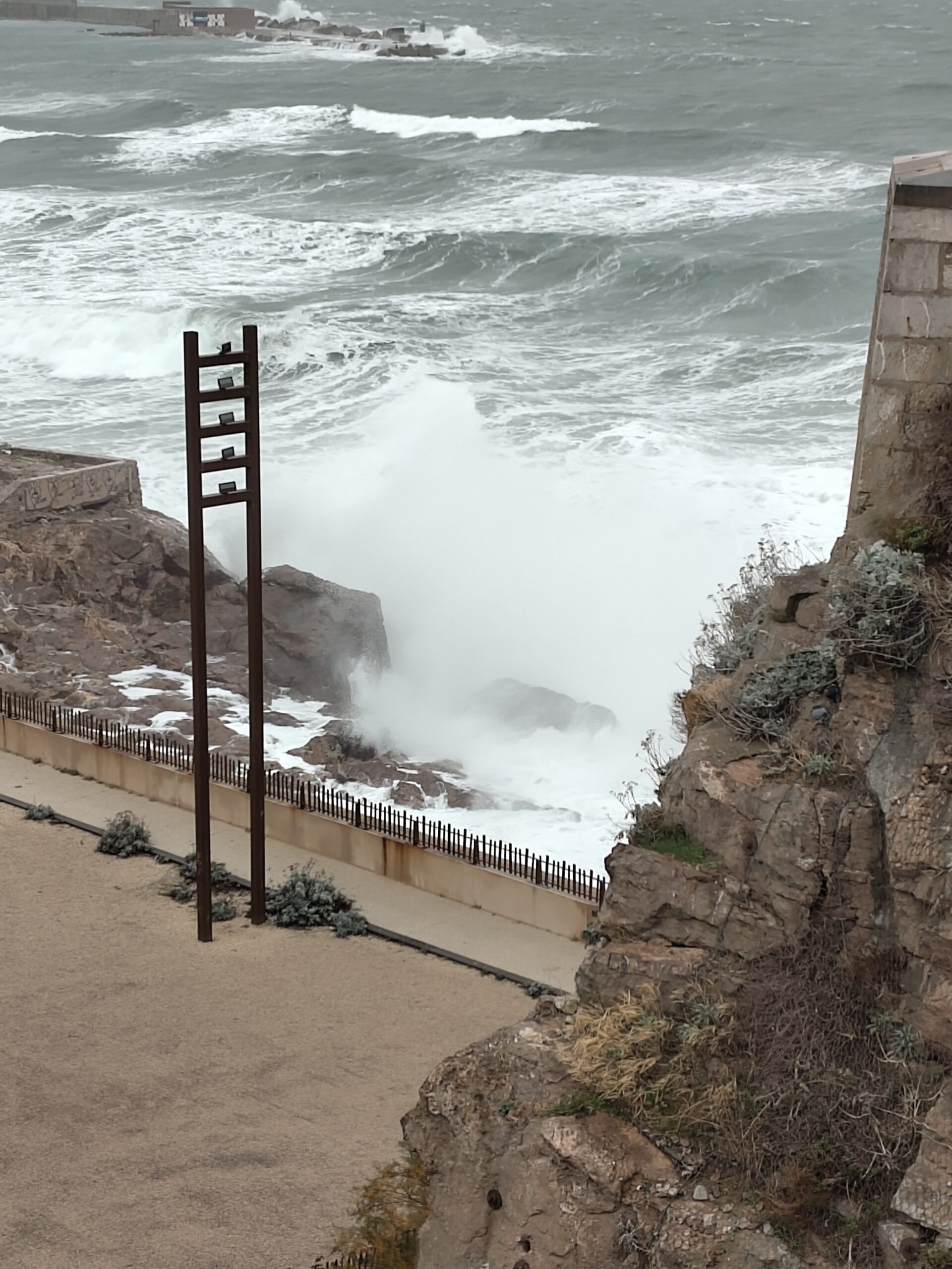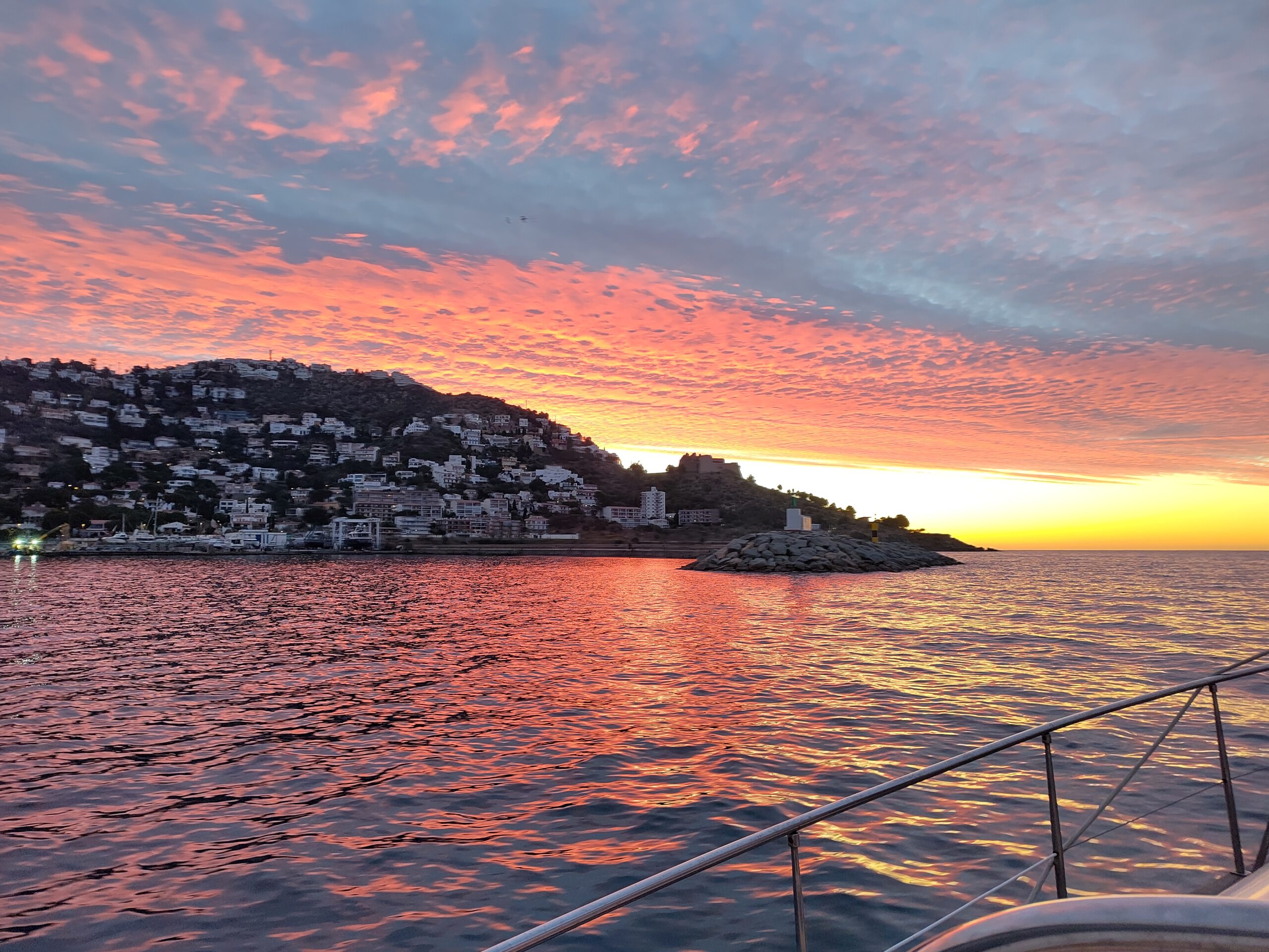 Am 23./24.11. ging es dann in großen Schritten wieder über Carnet en Roussillion nach Spanien, Roses und damit raus aus dem Golf de Lion. Fast hatten wir nicht mehr daran geglaubt und Alternativen eruiert. Aber auch Roses hielt uns noch einmal fest. Mit Wucht kam der Sturm 3 Tage über die Pyrenäen, stärker noch als im Golf. Spitzenwinde bis 9 Bft und Böen bis 10/11 Bft peitschten die Wellen über die Bucht. Erstaunlich wie schnell sich auf die kurze Strecke vom Strand bis zur Hafenmauer die Wellen bildeten von deren Kämmen sich teilweise die Gischt löste und unser Boot mit einer kräftigen Salzkruste überzog.